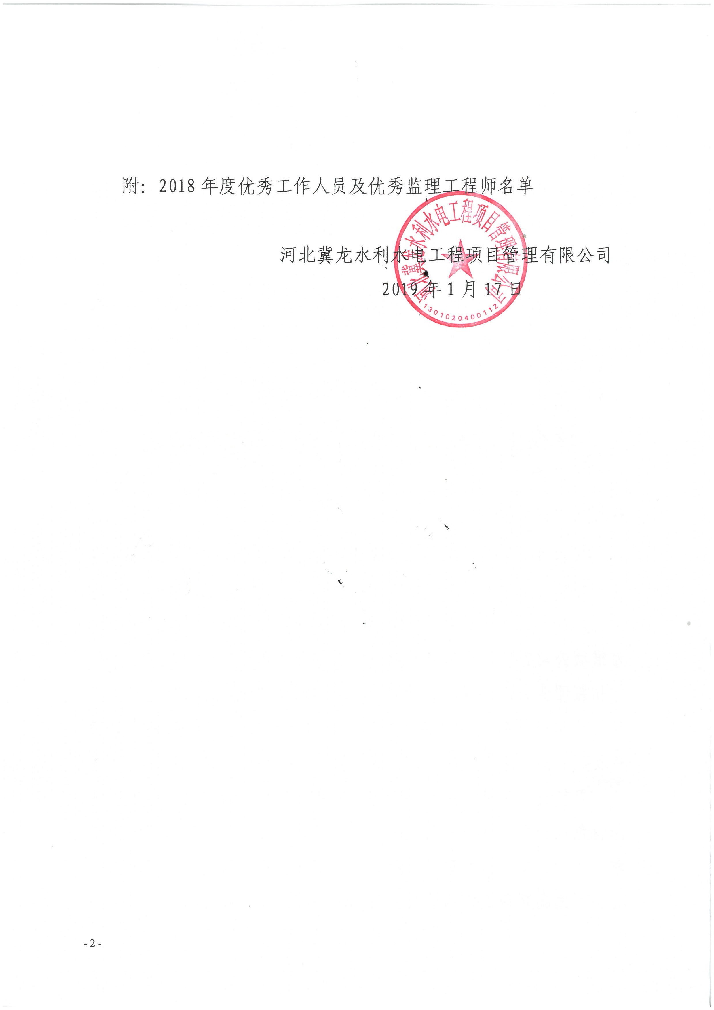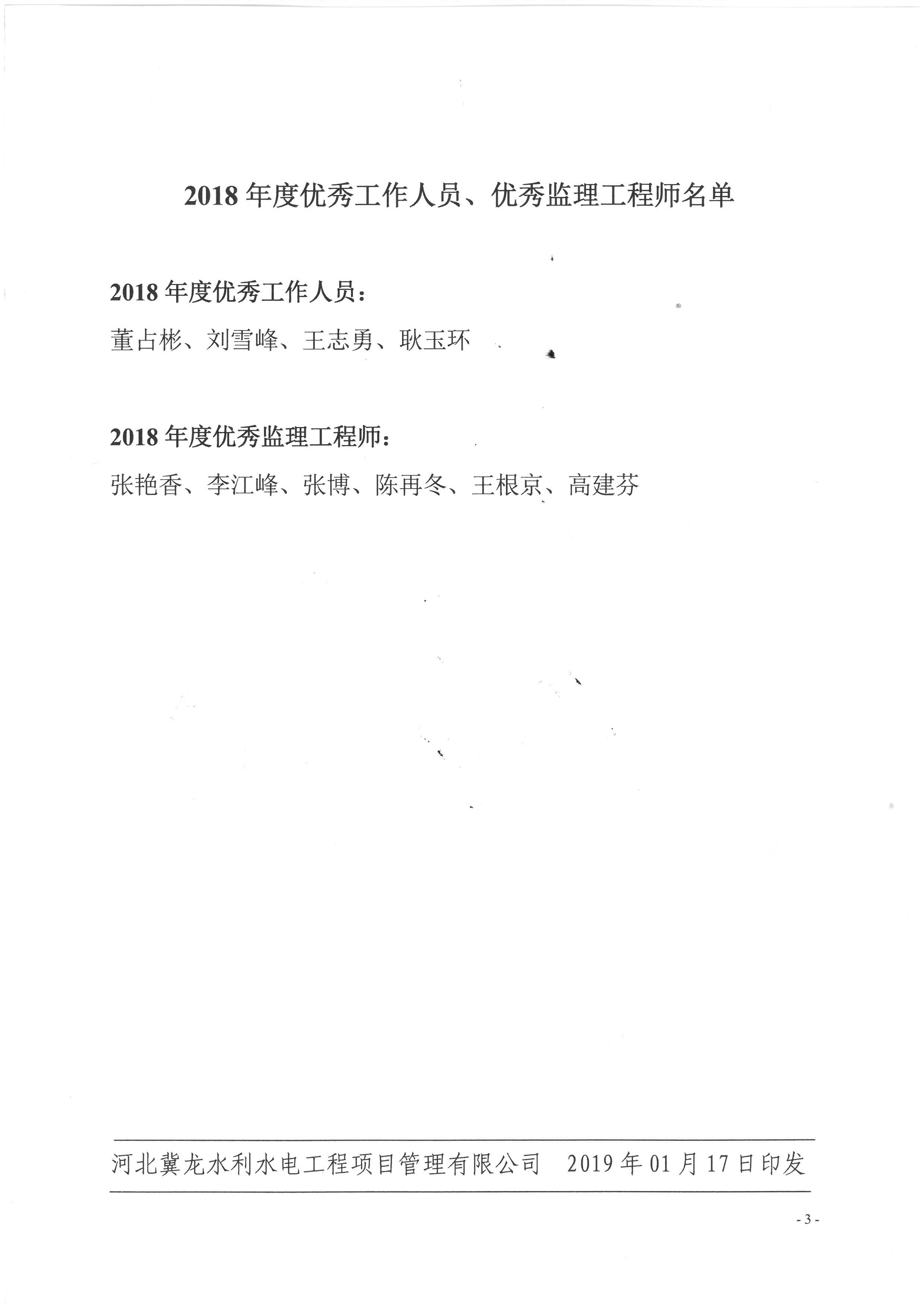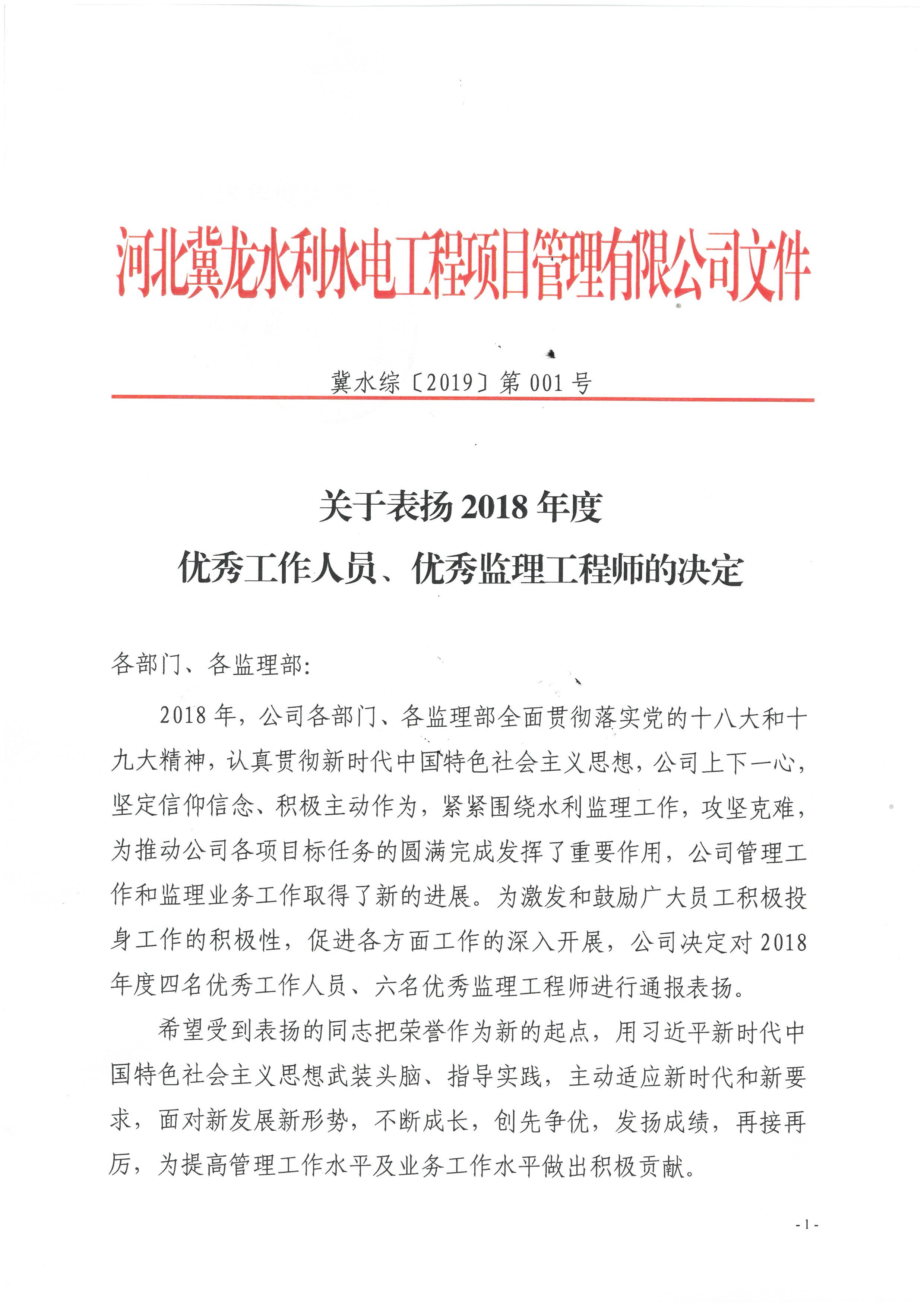 關于表揚2018年度優秀工作人員、優秀監理工程師的決定