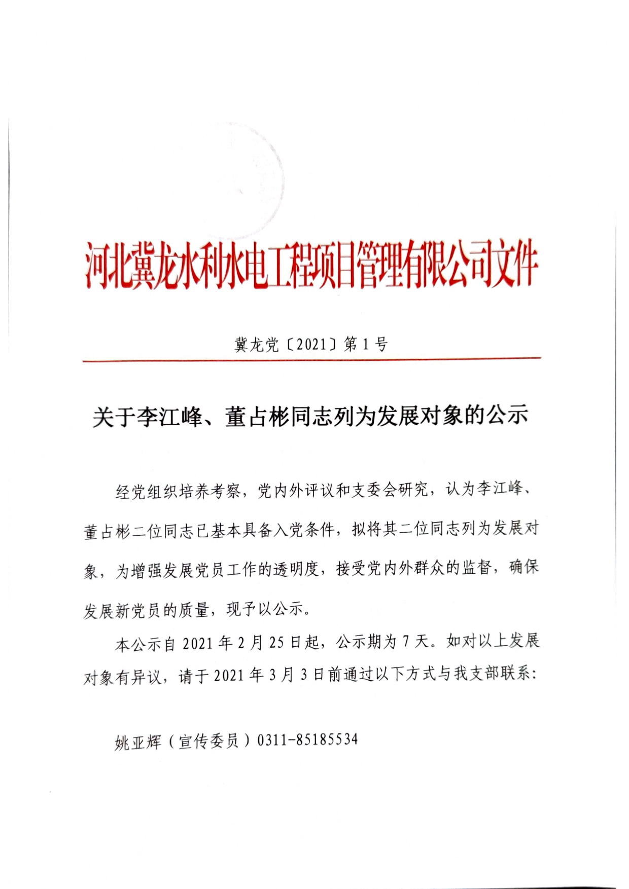 關于李江峰、董占彬同志列為發展對象的公示