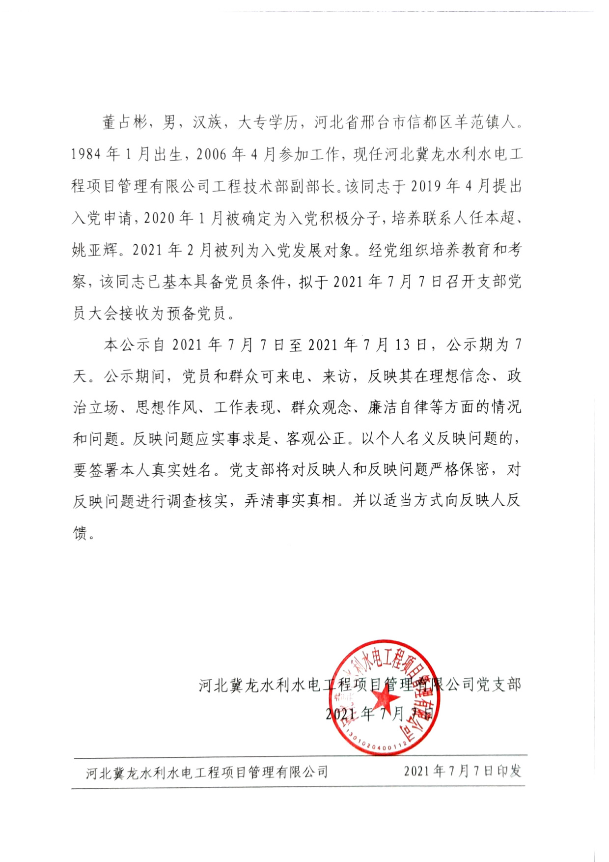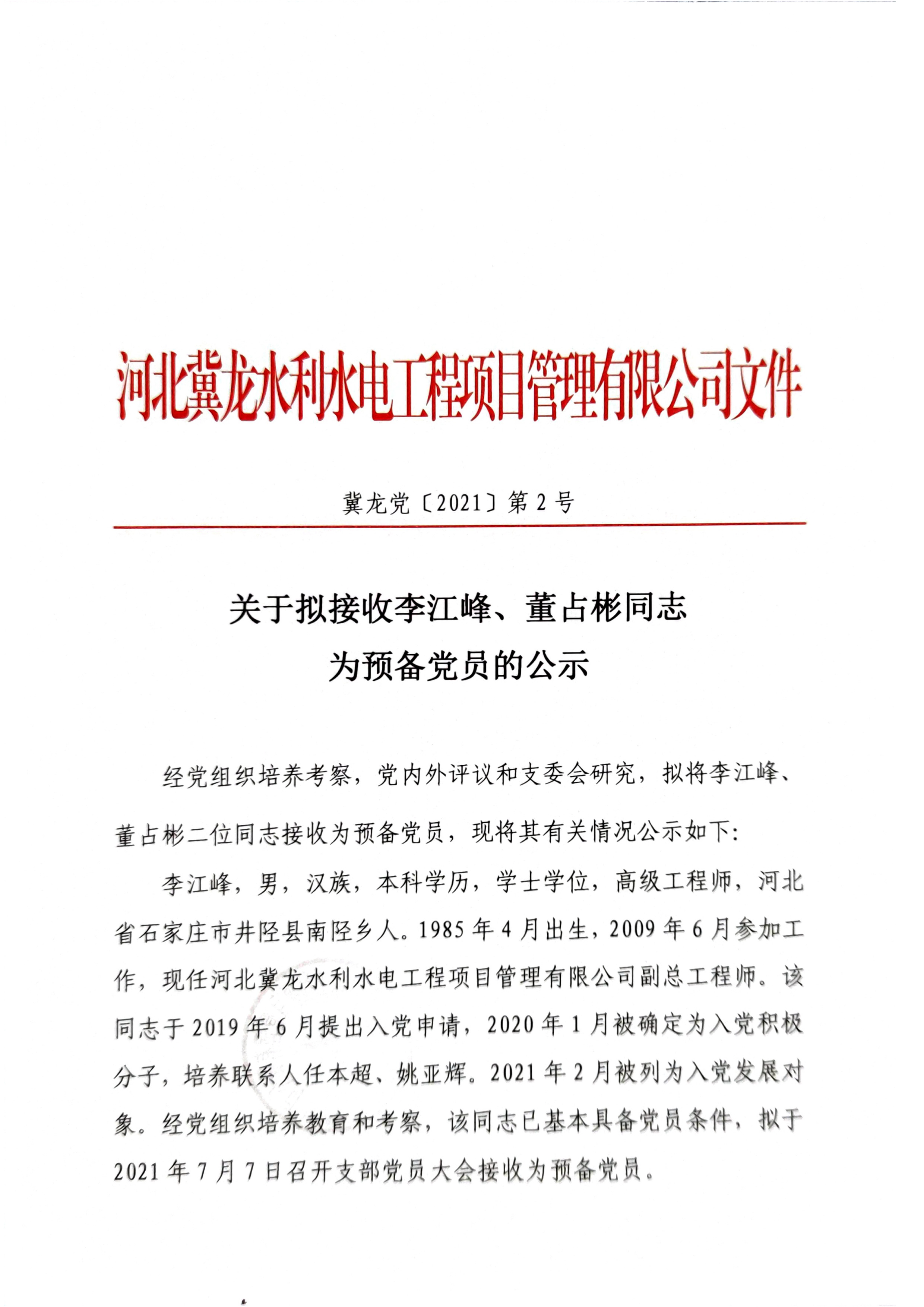 關于擬接收李江峰、董占彬同志為預備黨員的公示